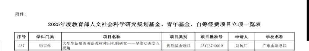 根据教育部社科司关于2025年度教育部人文社会科学研究一般项目立项的通知(教社科司函〔2025〕16号),我院教师刘传江申报的“大学生新形态英语教材使用机制研究——多维动态交互视角”获得规划基金项目立项,项目批准号:25YJA740019。