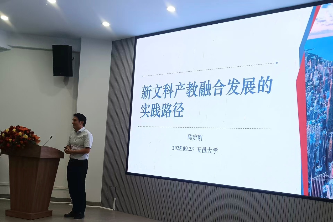 2025年9月23日,五邑大学人文与政法学院揭牌仪式暨新文科建设背景下产教融合发展战略研讨会在鹤山楼举行。外国语言与文化学院陈定刚博士应邀出席,并为大会作《新文科产教融合发展的实践路径》主题报告。