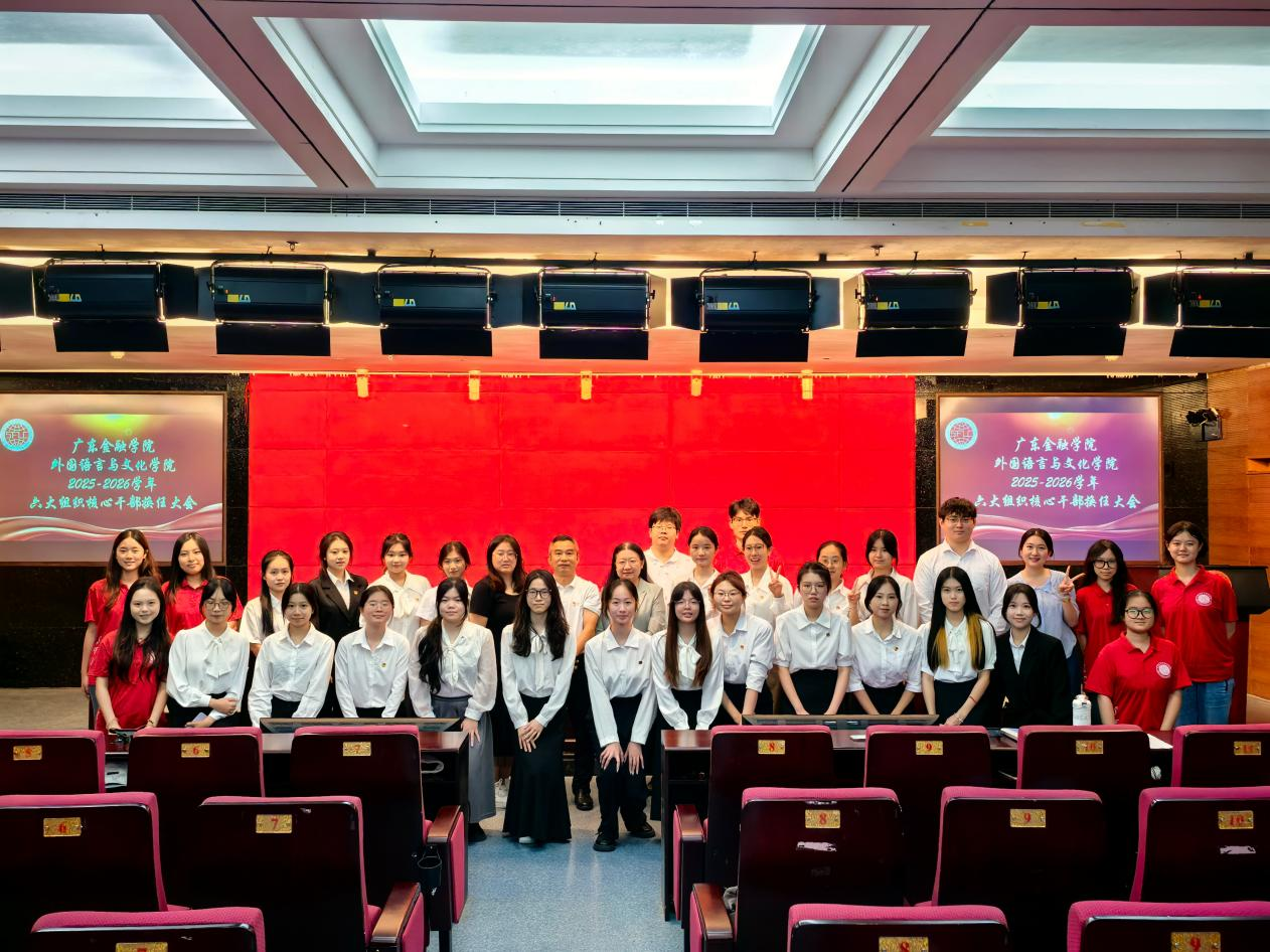 近日,外国语言与文化学院在新电学术报告厅隆重举办了2025年学院六大学生组织核心干部换届大会。本次大会的成功举行对于构建外文学院学生组织新格局,促进学院学生工作高质量发展具有重要意义。学院党委书记黄庆雄,副书记王丹和全体辅导员出席了会议。学院六大学生组织:学院学生党建中心、分团委、学生会、青年志愿者协会、红十字分会和学生新媒体中心全体学生干部一同参会,共同见证这一重要时刻。