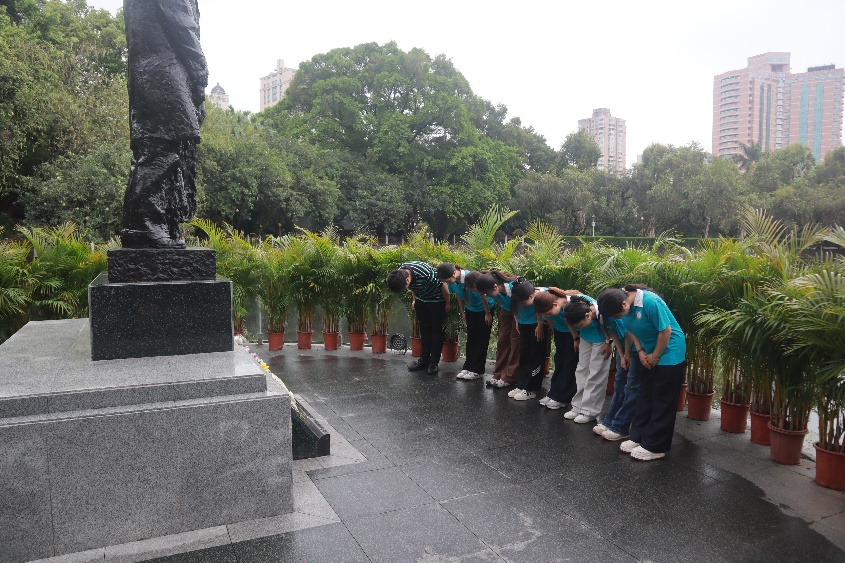 上午时分,天空微雨,更添几分庄重与肃穆。在巍峨耸立的广州起义纪念碑前,师生整齐列队,缓步前行。祭扫仪式正式开始,全场肃立,向革命烈士默哀一分钟,表达对先烈们的无限哀思与崇高敬意。随后,孙嘉程老师与学生代表缓缓走上台阶,向纪念碑敬献花圈。