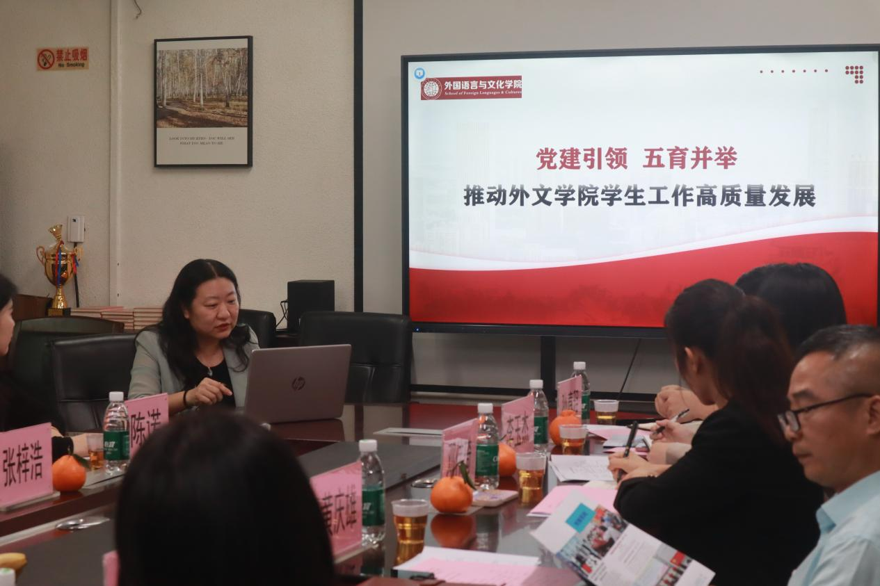 为促进学生工作专业化水平,共享学生管理经验,共谋外语类学院高质量发展,4月17日下午,华南师范大学外国语言文化学院(以下简称“华师外国语学院”)党委副书记陈彦敏率学院学工队伍一行四人赴我校外国语言与文化学院开展学生调研工作交流。外文学院党委书记黄庆雄、党委副书记王丹及双方学院辅导员等出席了交流会。