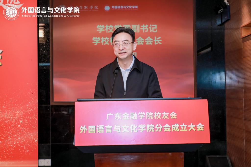 接着学校党委副书记、学校校友总会会长刘春阳致辞并讲话,他对校友会外文学院分会的成立表示热烈祝贺。同时他回顾了外文学院的发展历程与办学成就,肯定了广大外文校友在各行各业深耕实干、助力社会发展与母校建设的突出贡献,希望分会以成立为契机,搭建起校友与母校、校友与校友间沟通联动的坚实桥梁,凝聚校友力量赋能学院学科建设、人才培养与学术创新,助力学校高质量发展再谱新篇。