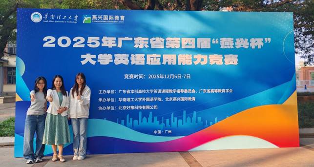 2025年12月7日,由广东省本科高校大学英语课程教学指导委员会、广东省高等教育学会联合主办,华南理工大学与北京燕兴国际教育承办,北京好策科技有限公司协办的第四届广东省“燕兴杯”大学英语应用能力竞赛在华南理工大学落下帷幕。我校外国语言与文化学院副院长洪溪珧老师带队参加了本次省赛的线下复赛与决赛。