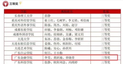 广东金融学院日语系教师李莹、黄跃瑜、曾晓青组成的教学团队,围绕日语专业课程思政教学设计目标,创新教学理念、深挖教学素材,凭借扎实的教学功底与新颖的思政案例设计脱颖而出,荣获“日语专业组”三等奖。
